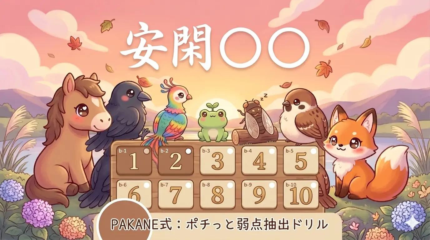 PAKANE式ドリルは「よみ方・前二字・後二字」の3部構成で、記憶を多角的に定着させます。